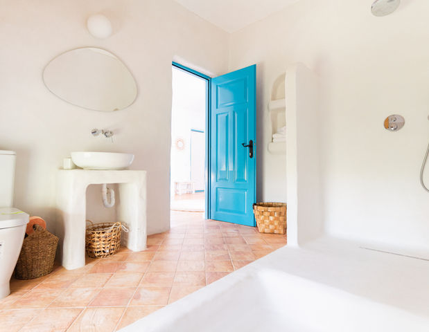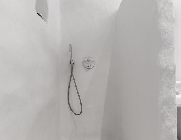 Terasa proprie, vestibul, baie si spatiu de dormit cu pat matrimonial, amenajate intr-un reconfortant minimalism cu rezonanta locala.
