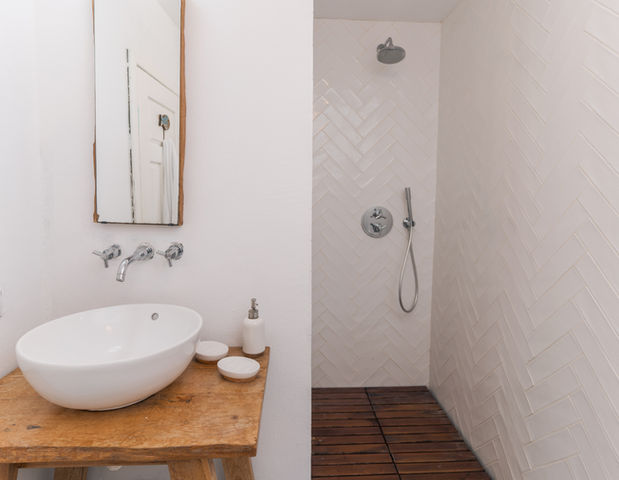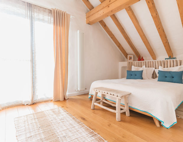 Terasa proprie, vestibul, baie si spatii de dormit (pat matrimonial + 2 paturi twin) amenajate intr-un reconfortant minimalism cu rezonanta locala.