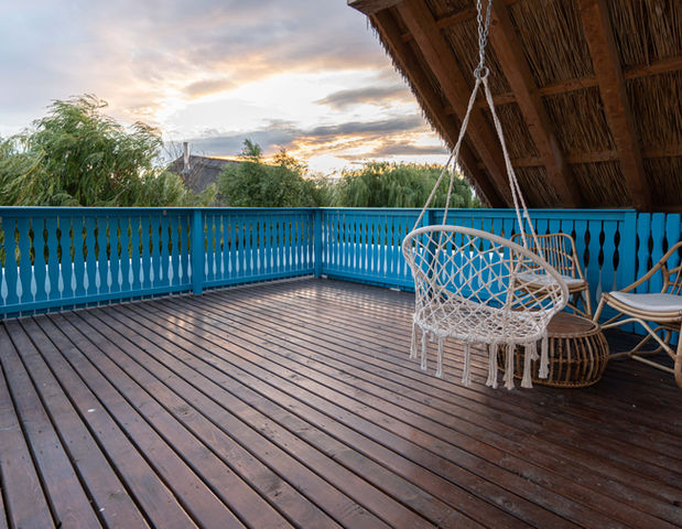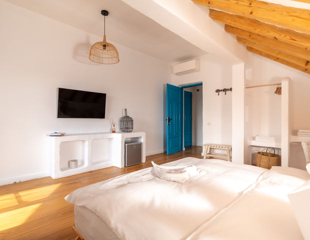 Terasa proprie acoperita, baie si spatiu de dormit cu pat matrimonial, amenajate intr-un reconfortant minimalism cu rezonanta locala..